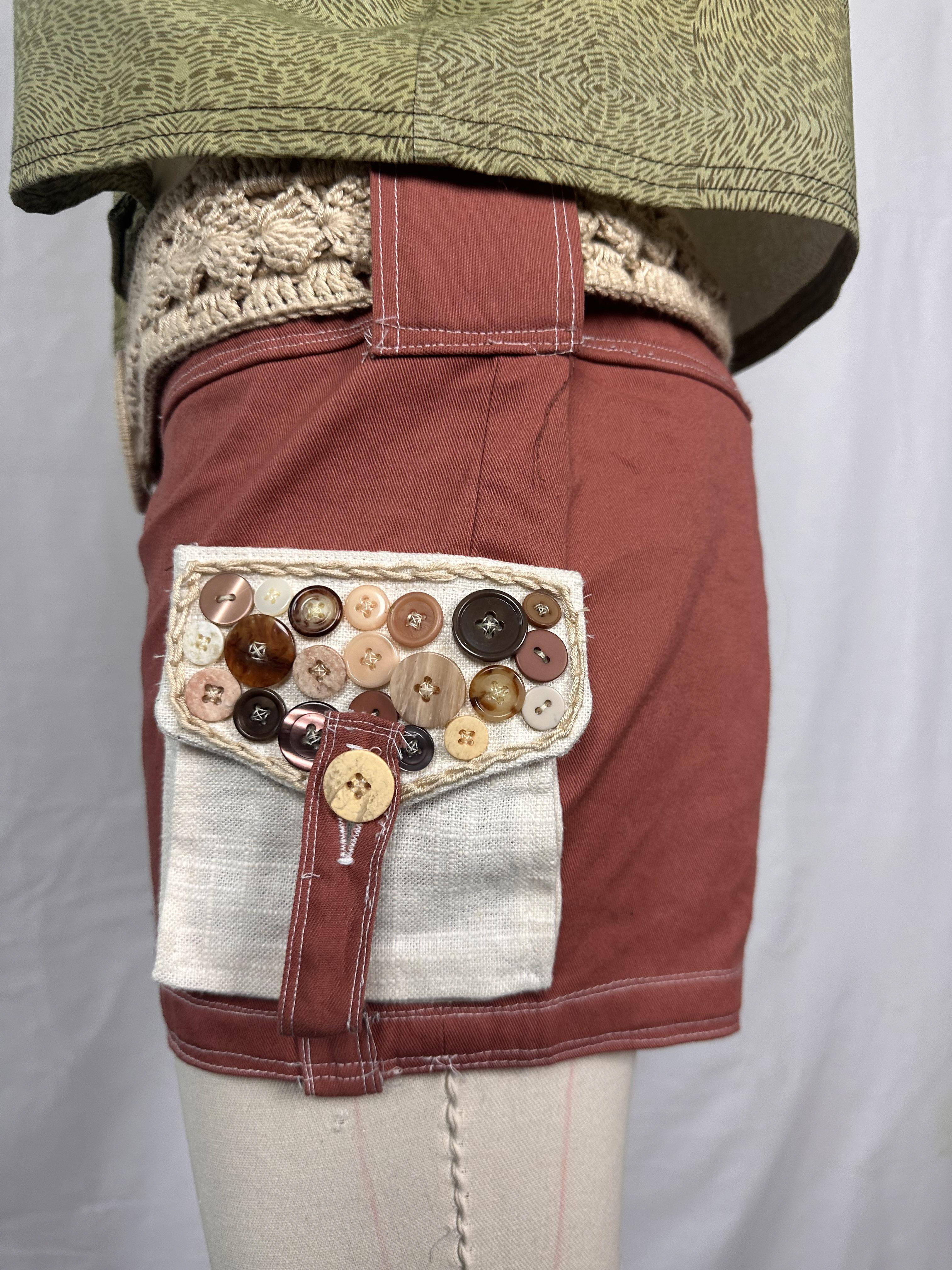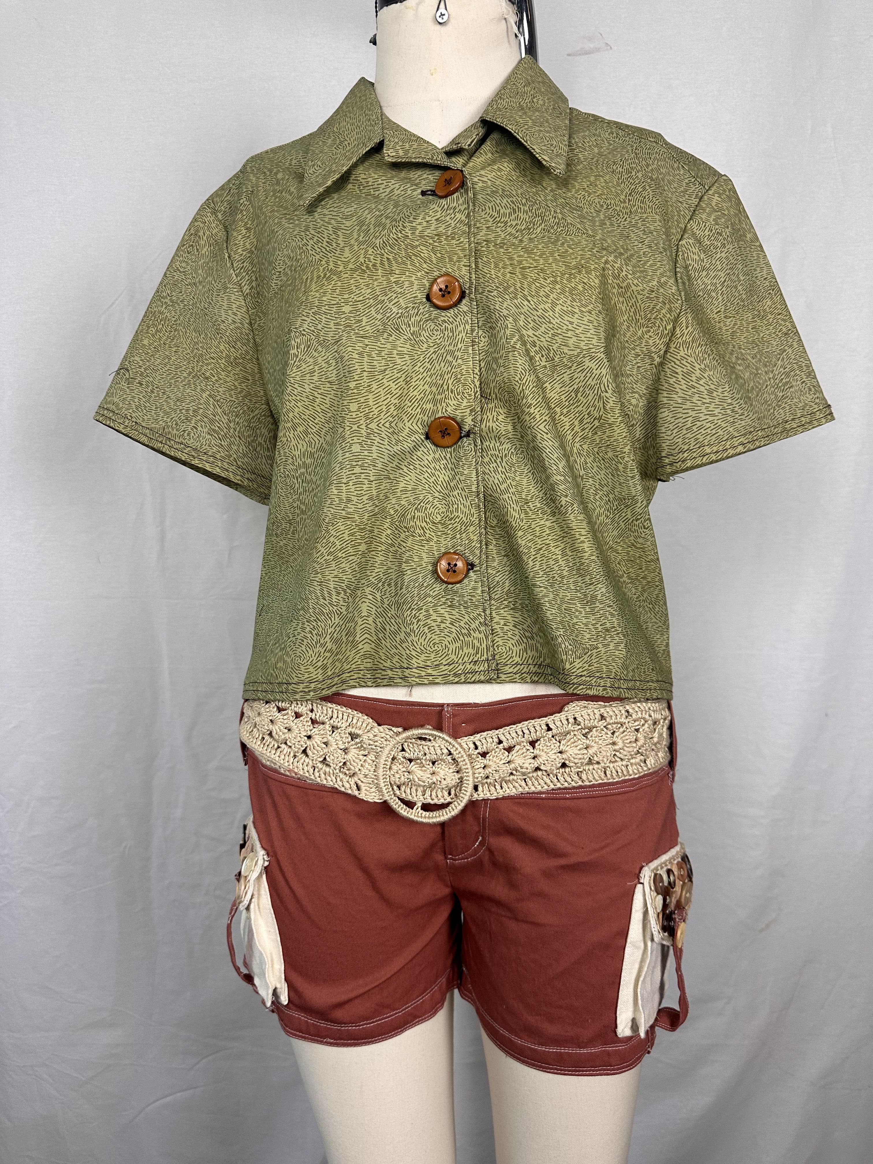Camp shirt fabric was designed using hand-drawn pattern digitally rendered and duplicated to create solid fabric. Shorts fabric chosen to match well with designed fabric, with bellow pocked, multiple sewn buttons and crochet belt to enhance shorts.
