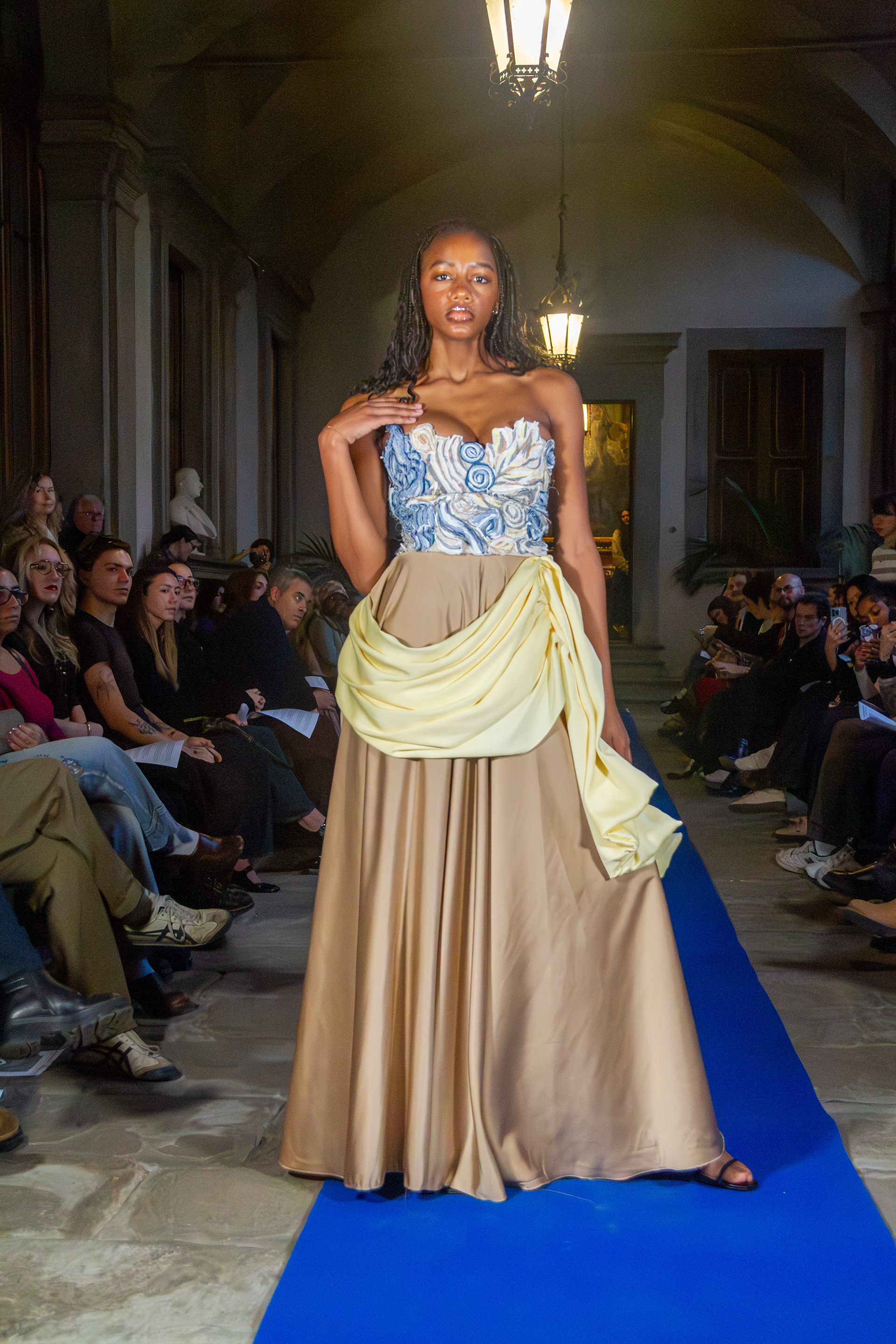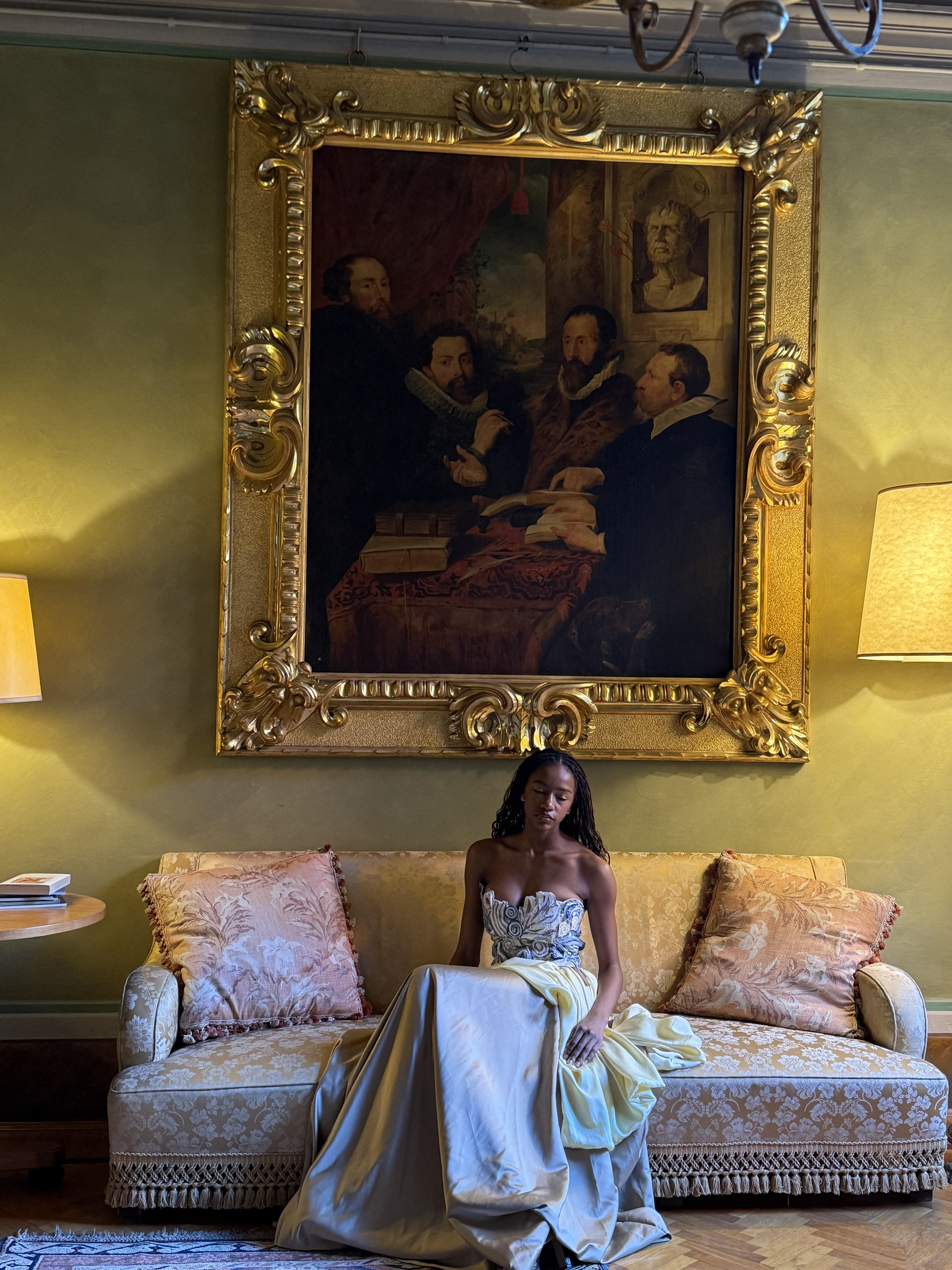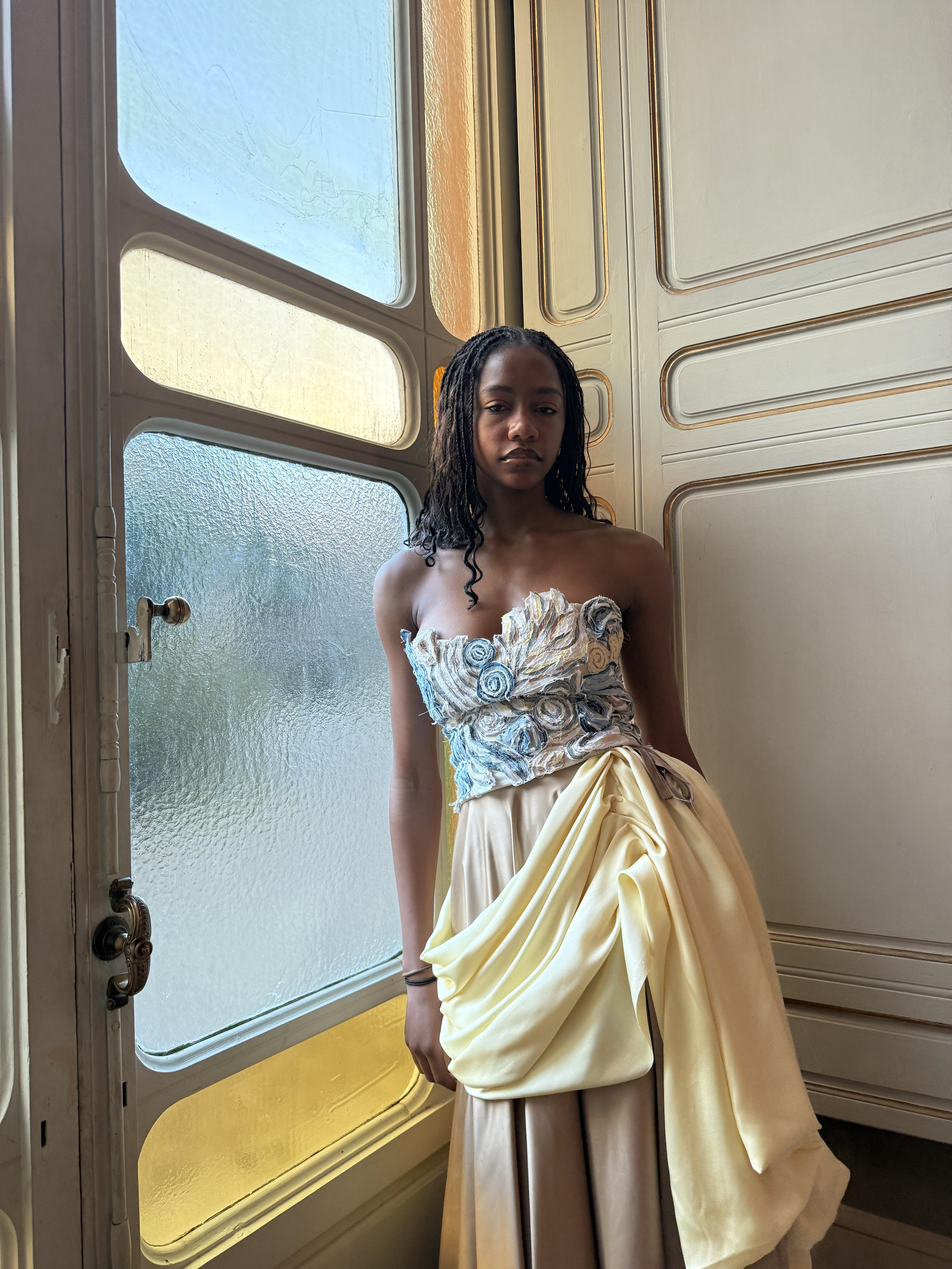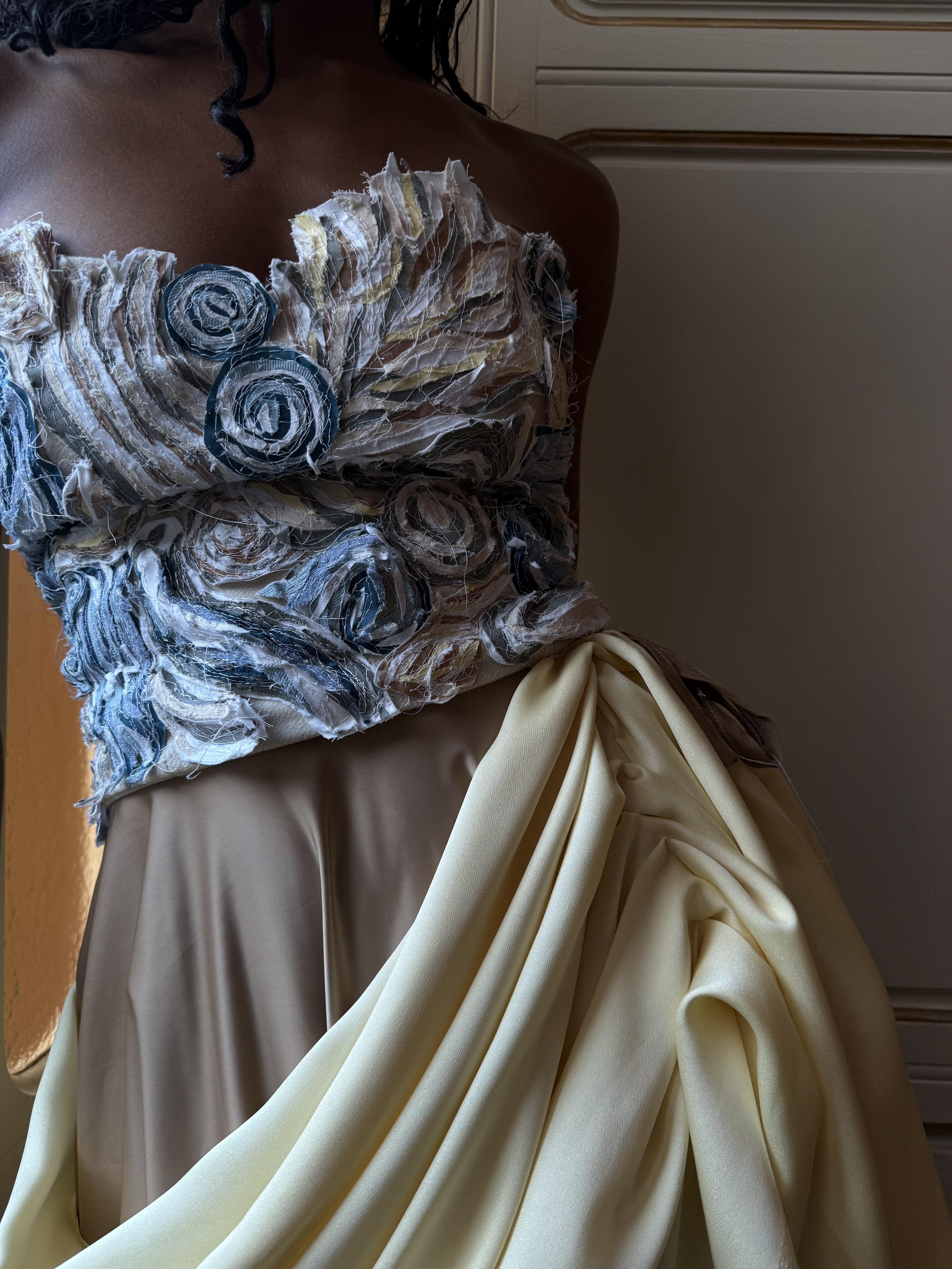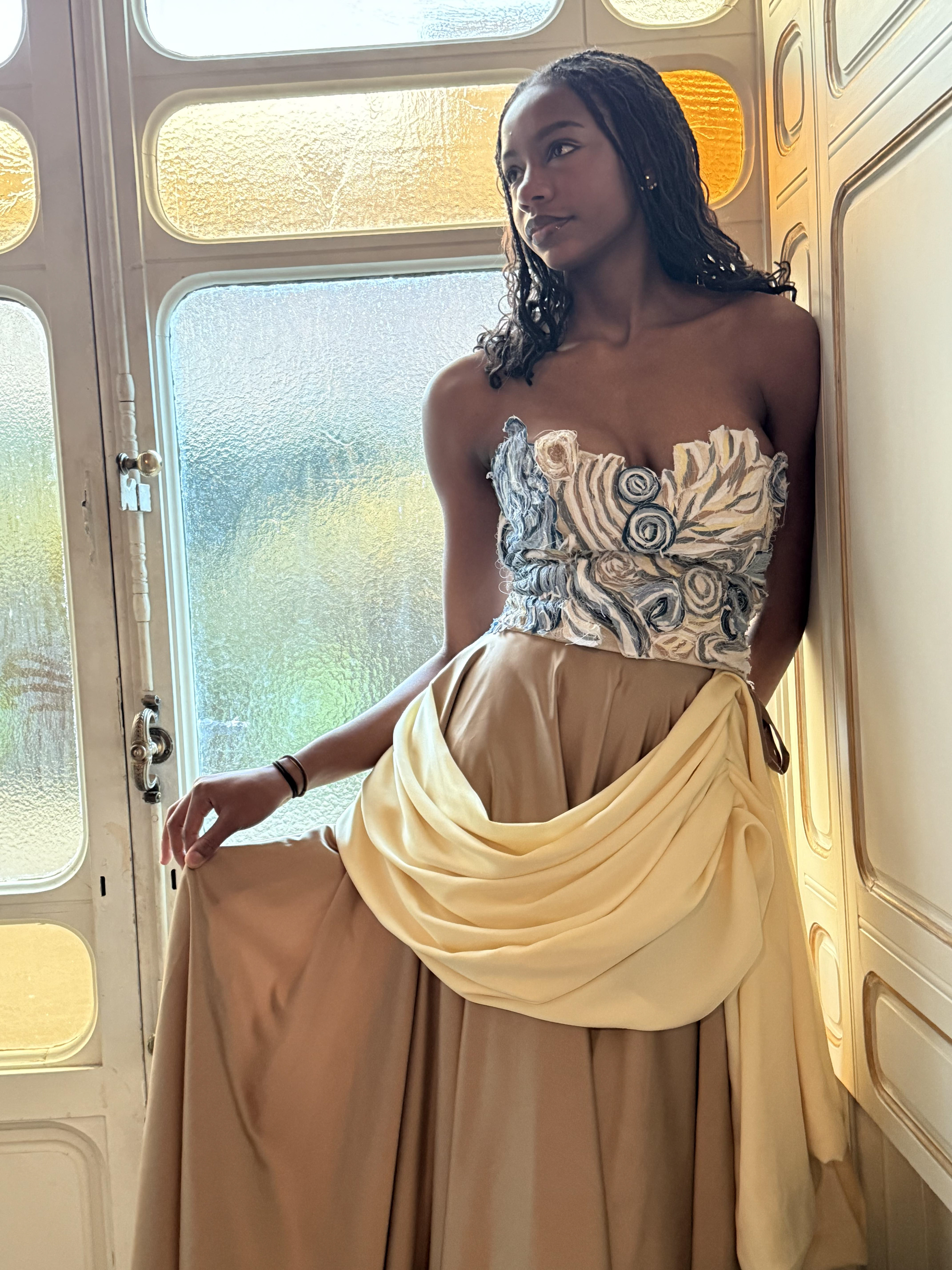 A corset and skirt set paying homage to the marble sculptures that surrounded Gabriella during her time studying abroad in Florence, Italy. The corset is creating using small scrap pieces of fabric sewn together and hand stitched onto a corset, with some pieces extending of the corset becoming 3 dimensional.