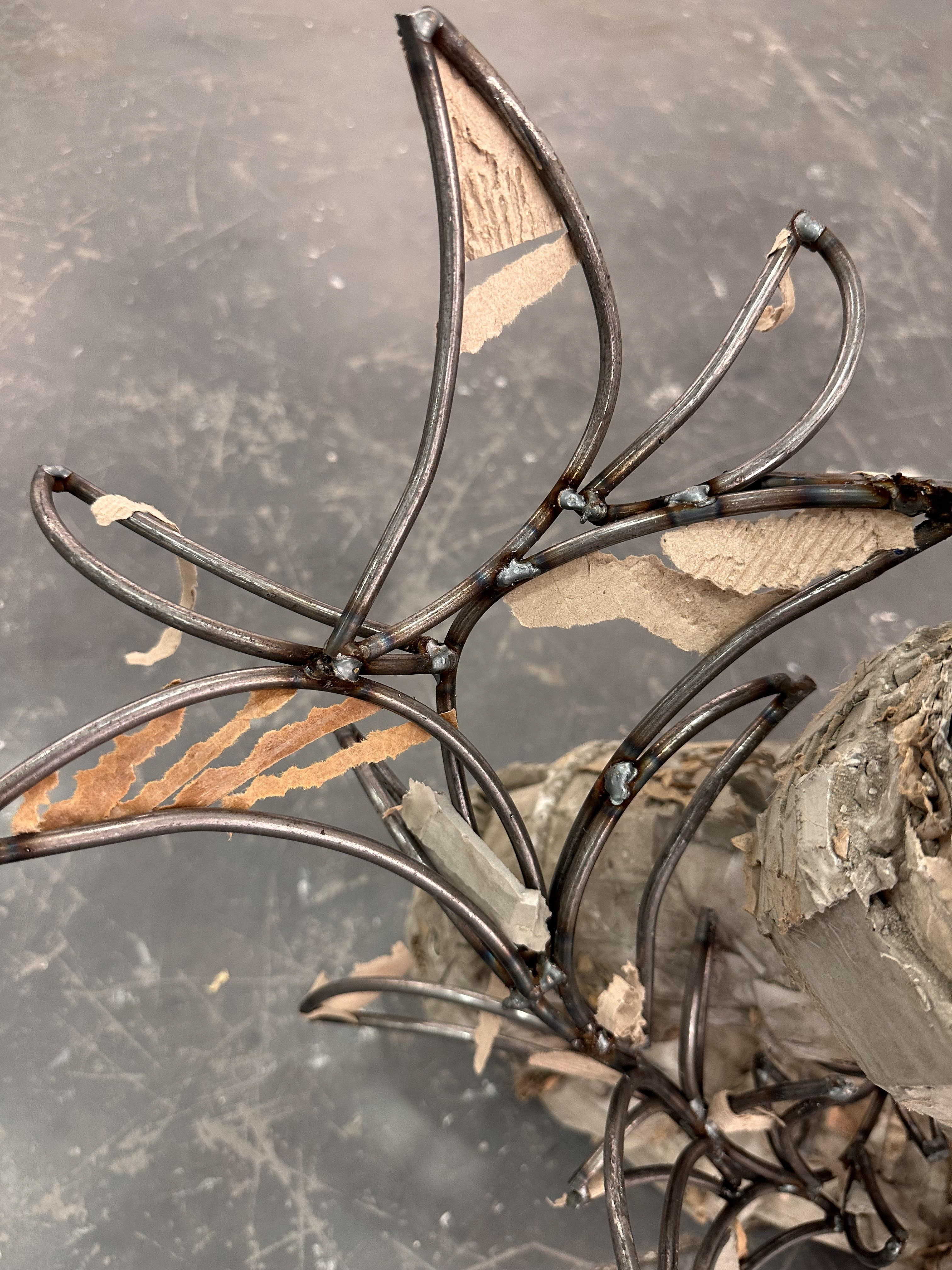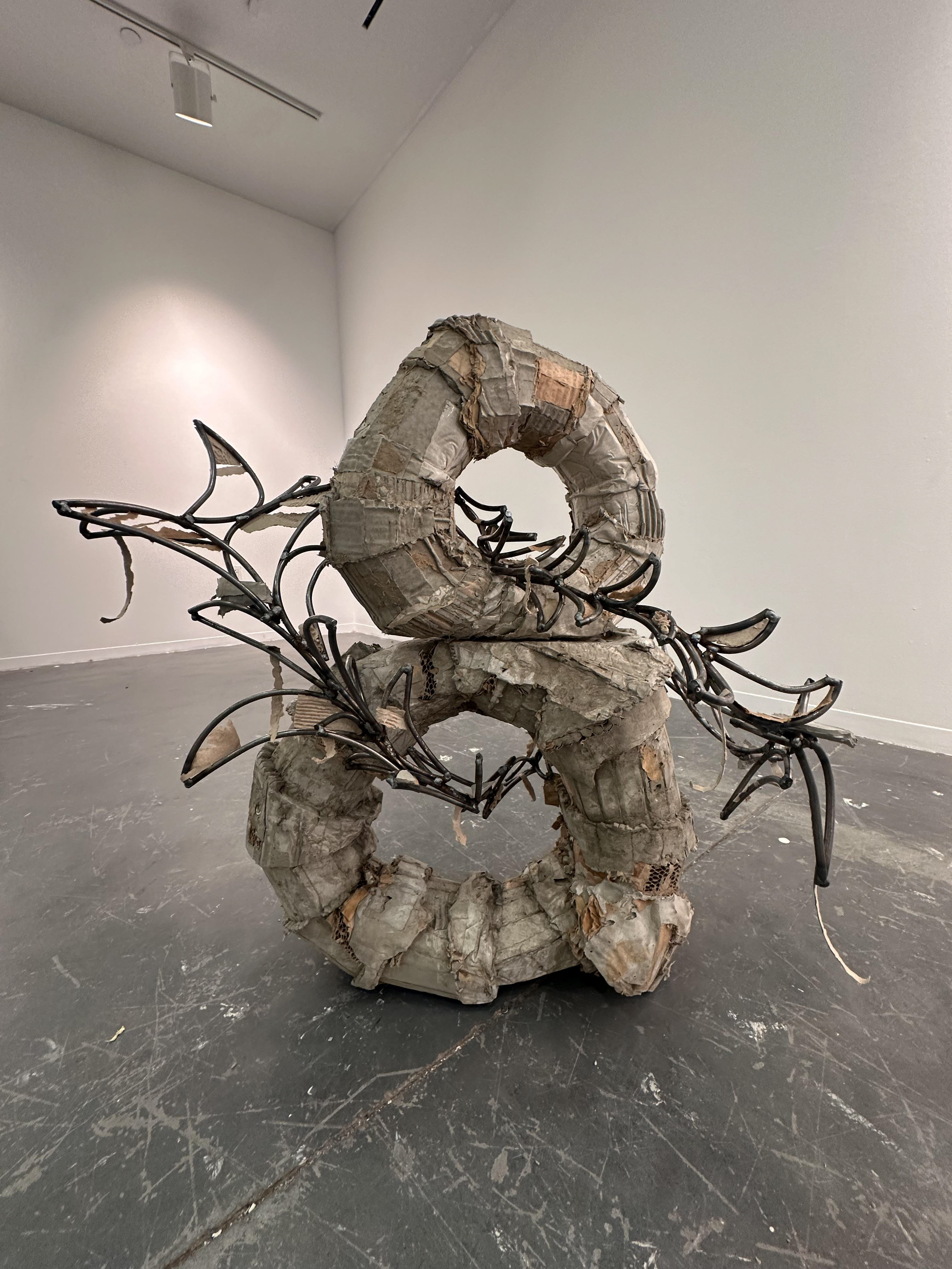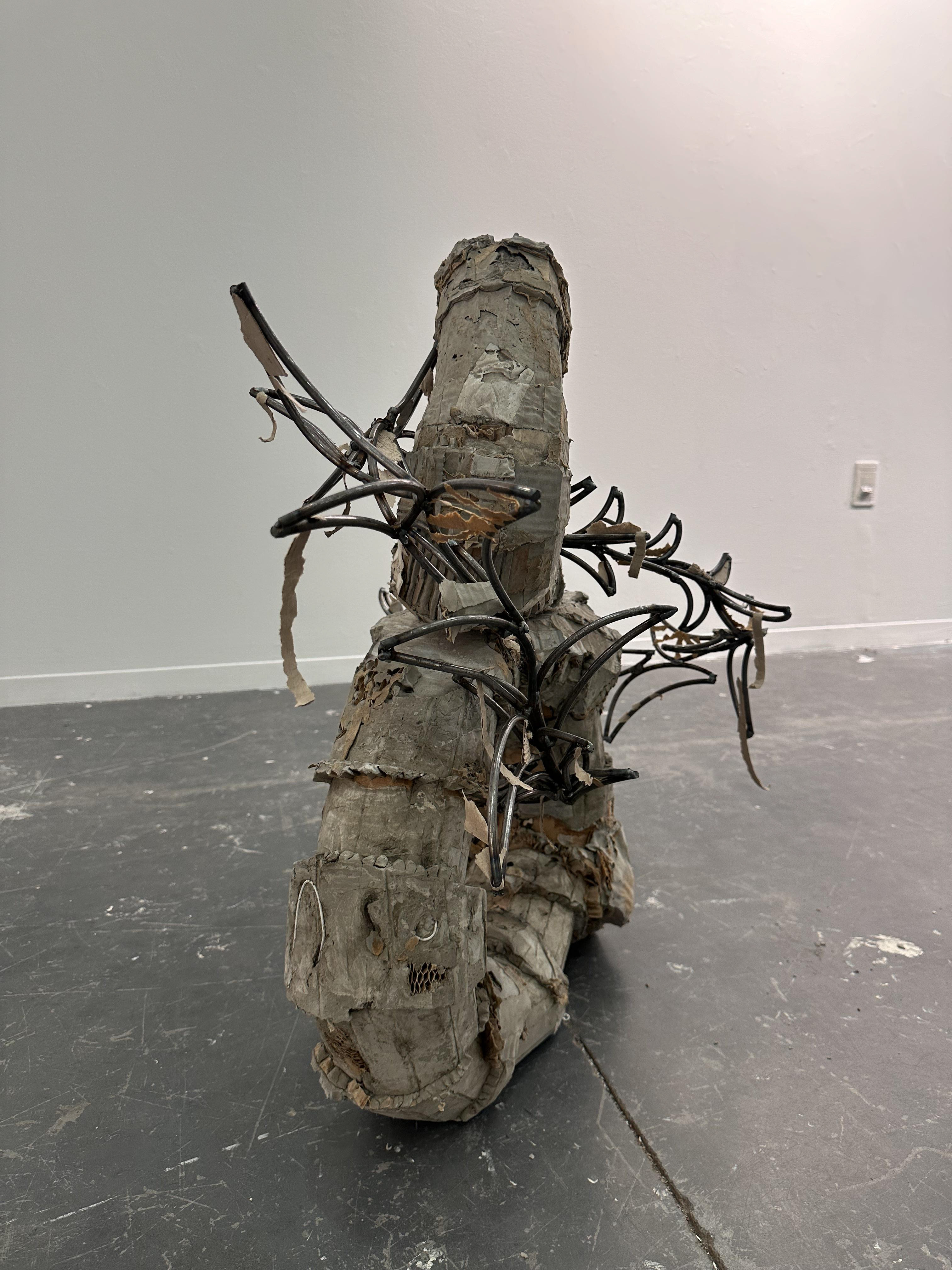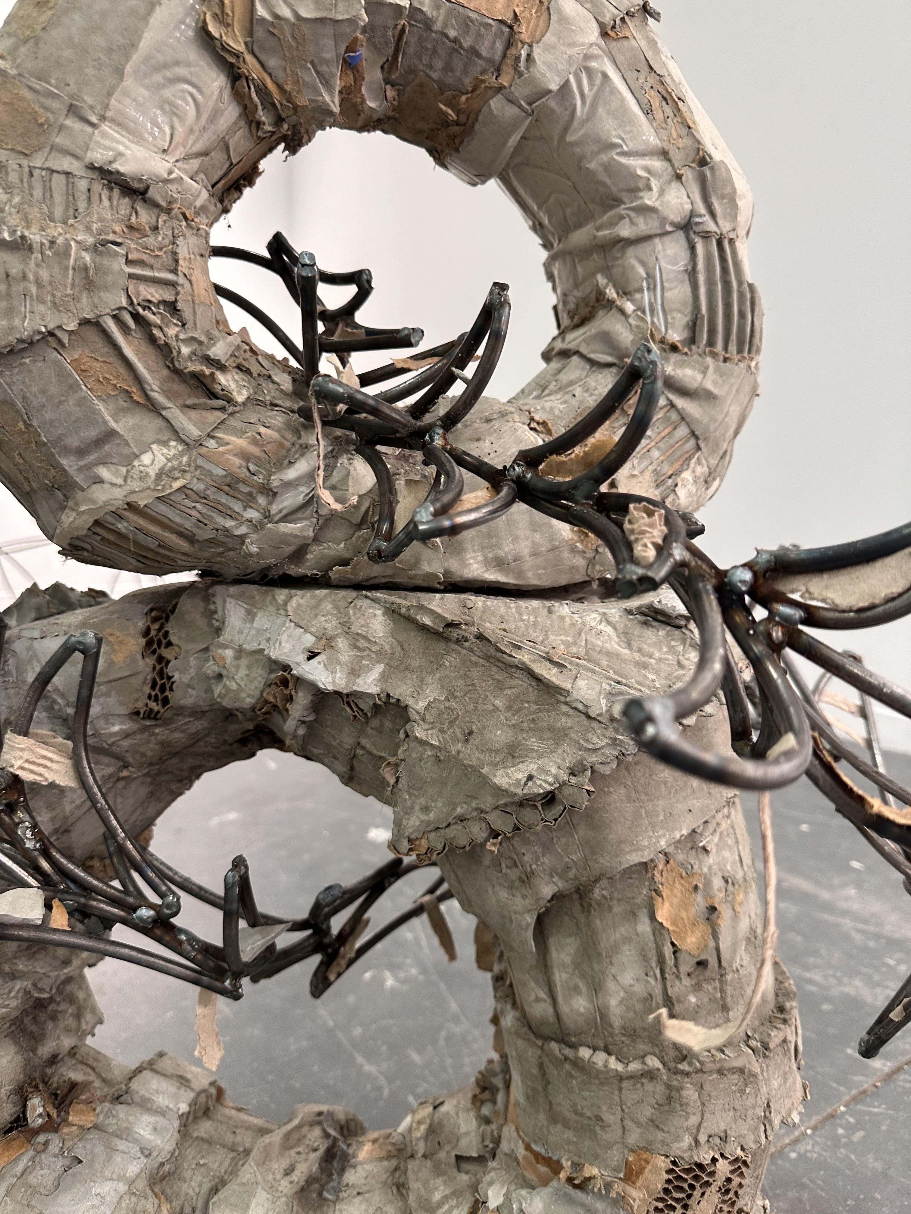 Two cement poured circles, with cardboard elements imbedded into the structures, connected through thick wire welded together. Meant to signify the two sides of the brain and how they work together to function.