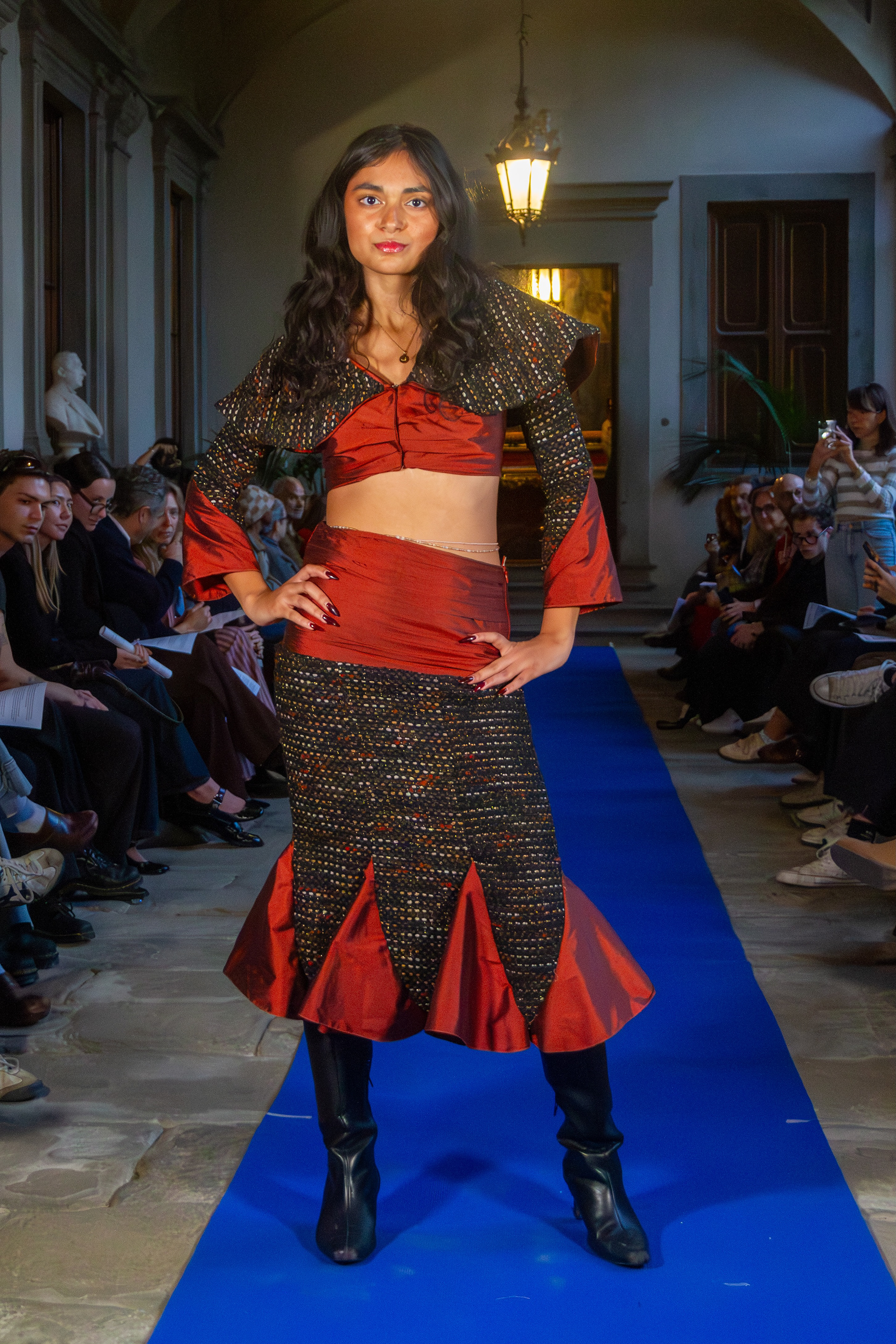 A 2 piece skirt and jacket set with a strong emphasis on tailoring and enhancements such as pleating and godets.