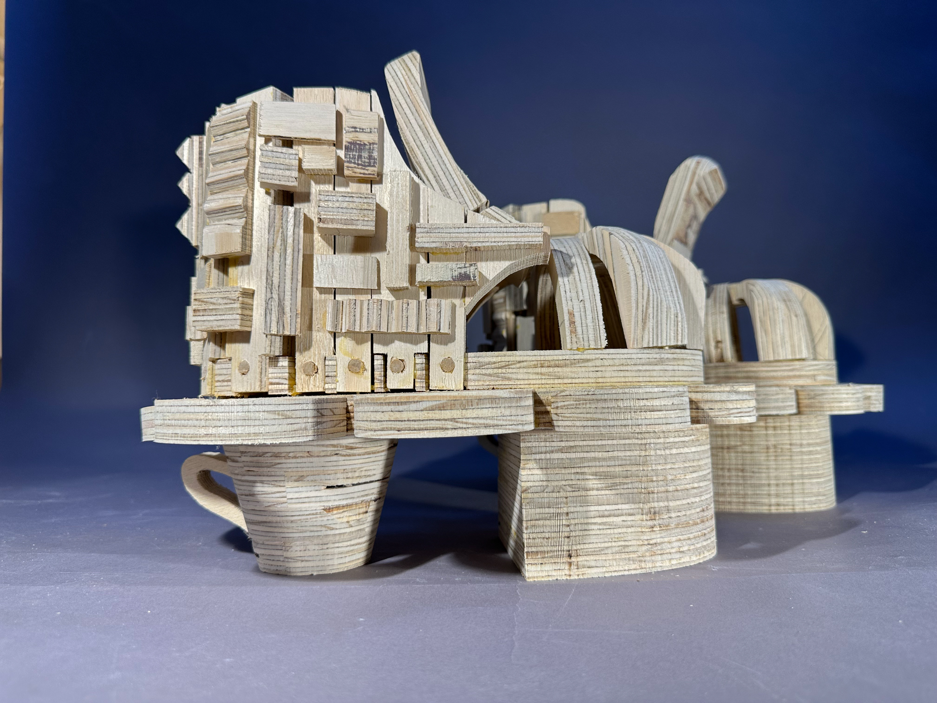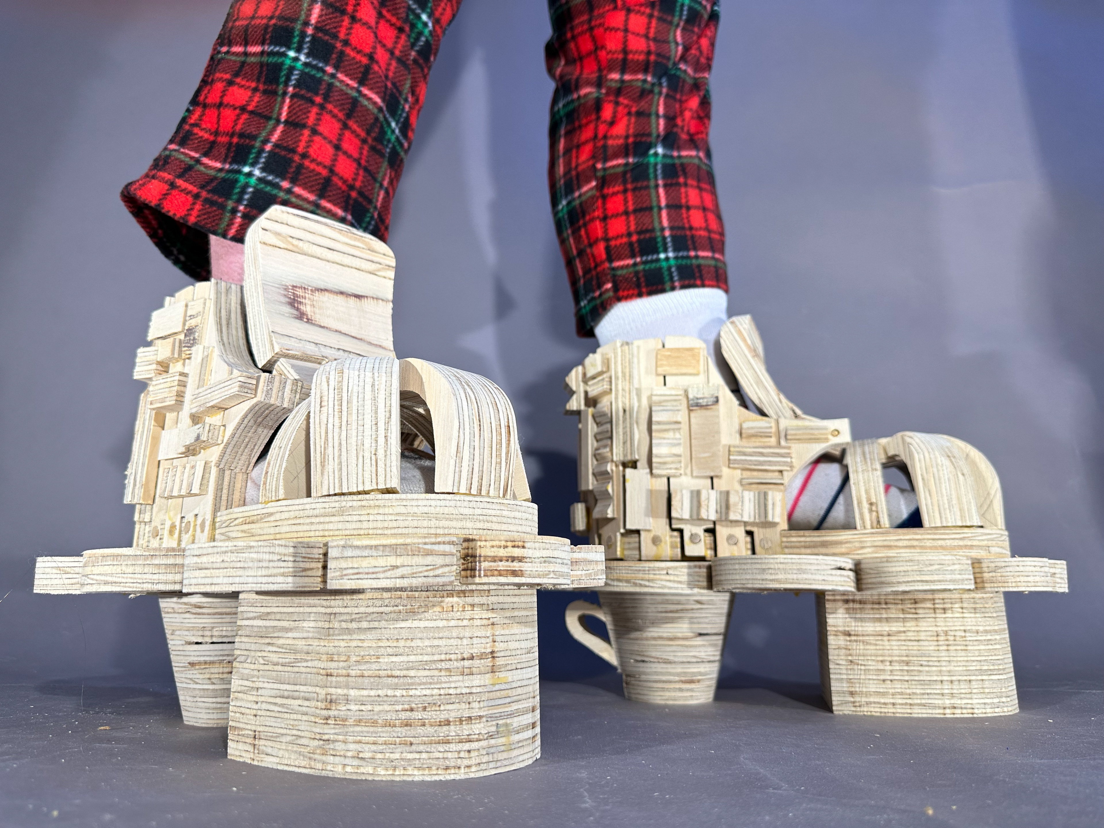 Mad Hatter inspired wooden shoes that can be worn and walked in. Teacup and textured detailing to emulate personality of the Mad Hatter.